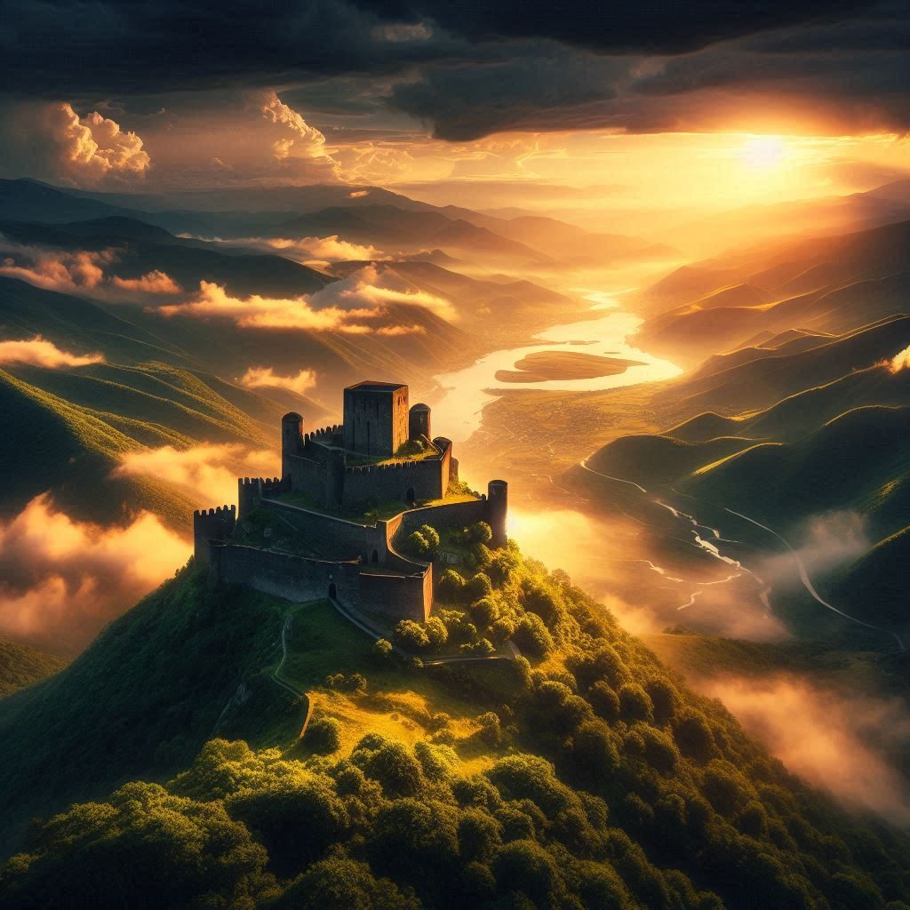 Die Hügel heben sich, immer höher hinauf, sanft, doch zielgerichtet, bis sich ganz oben, stolz und unerschütterlich, eine Festung erhebt – ein Thron auf dem steinernen Gipfel. Ihre Mauern dunkel, geheimnisvoll, getränkt von Geschichten, die der Wind dir nicht erzählt, getaucht in den goldenen Glanz der Sonne, die ihre Zinnen wie glühendes Metall leuchten lässt.