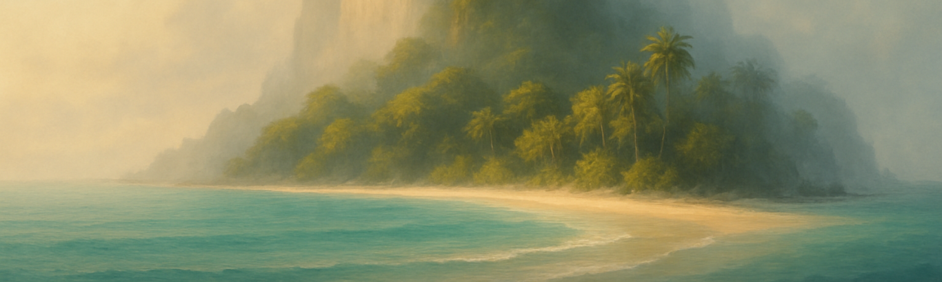 Du verlässt die Linie des Ufers, gehst hinein zu den Palmen, die hoch über dir ihre langen Blätter neigen, sanft schwingend im Wind, als würden sie dir einen Gruß zuwinken. Der Wind trägt Salz auf seiner Zunge, den Geruch von Muscheln und Meerschaum, aber je weiter du gehst, desto mehr mischt er sich mit Wald – mit dem Duft von feuchtem Laub, von Baumharz, von Land. Und von einer Wärme, die nicht vom Meer kommt, sondern aus der Tiefe der Insel selbst.