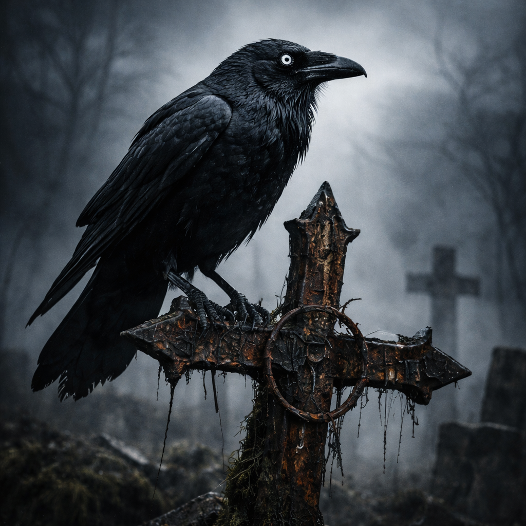 Ein pechschwarzer Rabe sitzt reglos auf einem verwitterten Kreuz. Sein Auge ist glasig. Uralt.